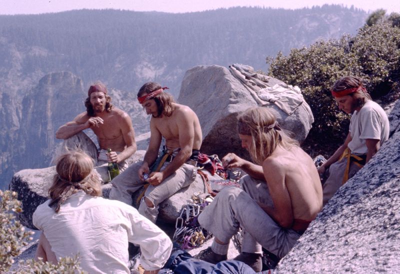 Епохата на “Stone Masters” – отляво Дейл Бард (Dale Bard), Джим Бридуъл (с бутилката в ръка), Фред Ийст (Fred East), Били Уестби (Billy Westbay), Джей Фиск (Jay Fiske), екипът е на върха на Ел Кап след изкатерването на “Pacific Ocean Wall”, 1975 г.