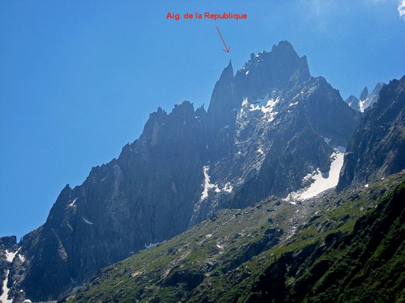 Егюий дьо ла Репюблик от близкото обкръжение на Гран Шармо – поглед от ледника Мер дьо Глас