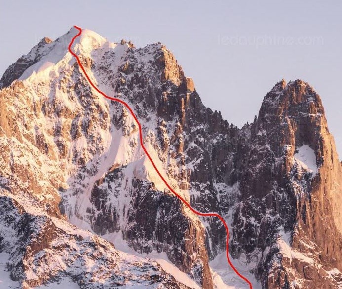 Североизточната стена Нанблан на Егюий Верт с маршрута, преминат от Пол Боном и Вивиан Брюше
