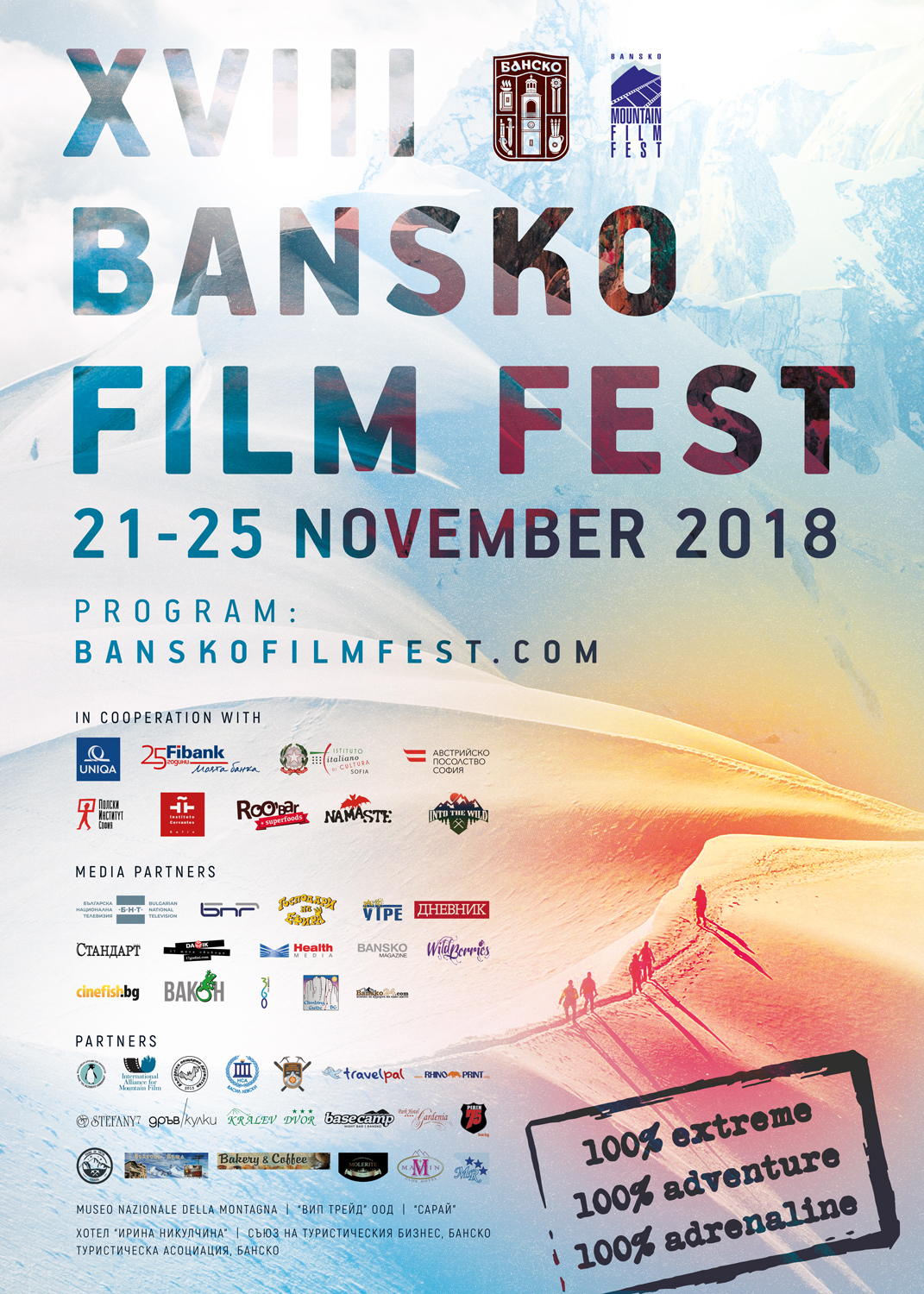 Наближава Банскофилмфест 2018 – най-големият форум за планини и екстремни спортове в България! От 21 до 25 ноември ще бъдат показани 100 филма от 30 държави, 10 звезди на екстремните спортове, 12 изложби, демонстрации, детска програма, партита и разбира се