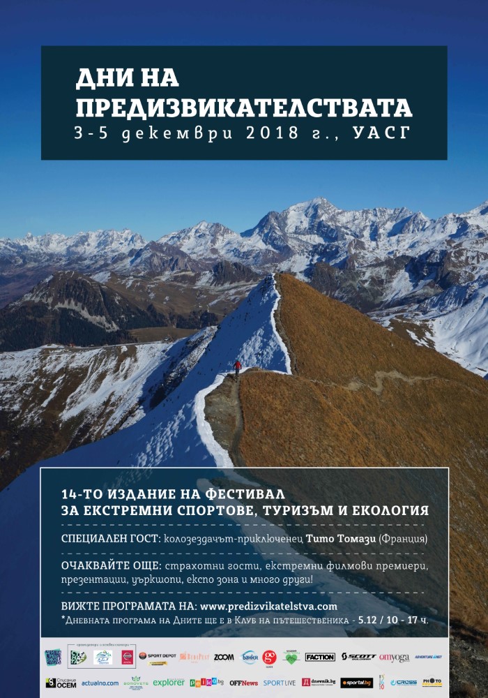 Ежегодните "Дни на предизвикателствата" и тази година ще се проведат в София - между 3 и 5 декември в Аула “Максима” на УАСГ. Филмите и презентациите включват широк спектър от теми: алпинизъм и катерене, приключения и пътешествия, уиндсърф, сноуборд, спелеология и др.