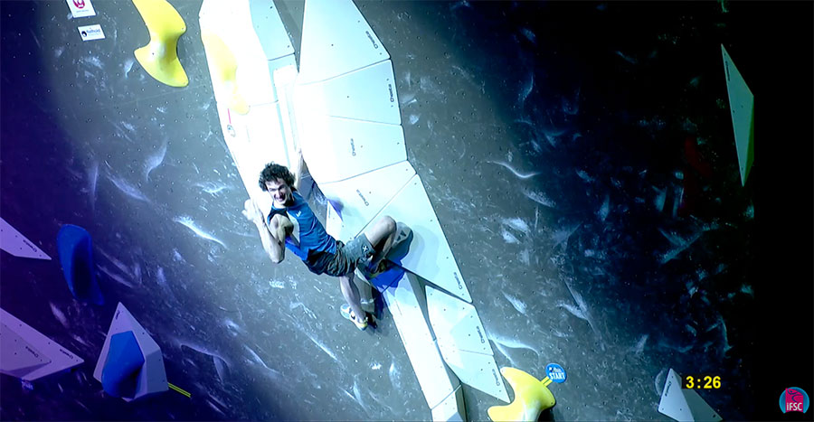 Това е моментът в който Адам Ондра спечели състезанието! Моментът е в който той заклещи стабилно ръката си в цепка, типичен hand jam, така както се е научил да го прави в Йосемитите! Никой от другите финалисти не можа да направи това. Ондра даже поздрави публиката преди да е достигнал финалната хватка.