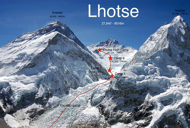 Връх Лхотце (8516 м) и пътя към него (източник: Everest View Tracks & Expedtions)