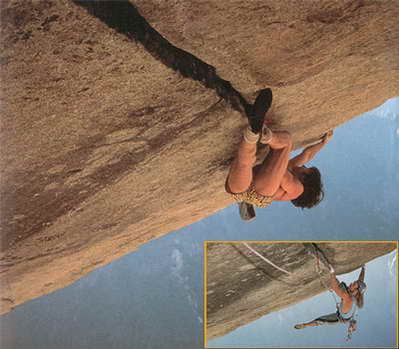 ![]() Хайнц Зак при соловото си изкачване по Separate Reality тази година. | ![]() Волфганг Гюлих при соловото си изкачване през 1986 г. по Separate Reality, сниман от Хайнц Зак (на маката снимка катери по същия маршрут). |