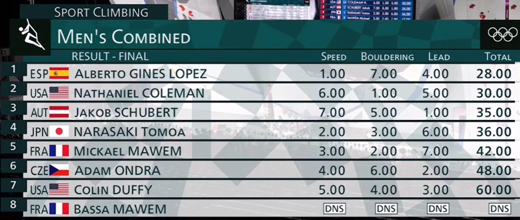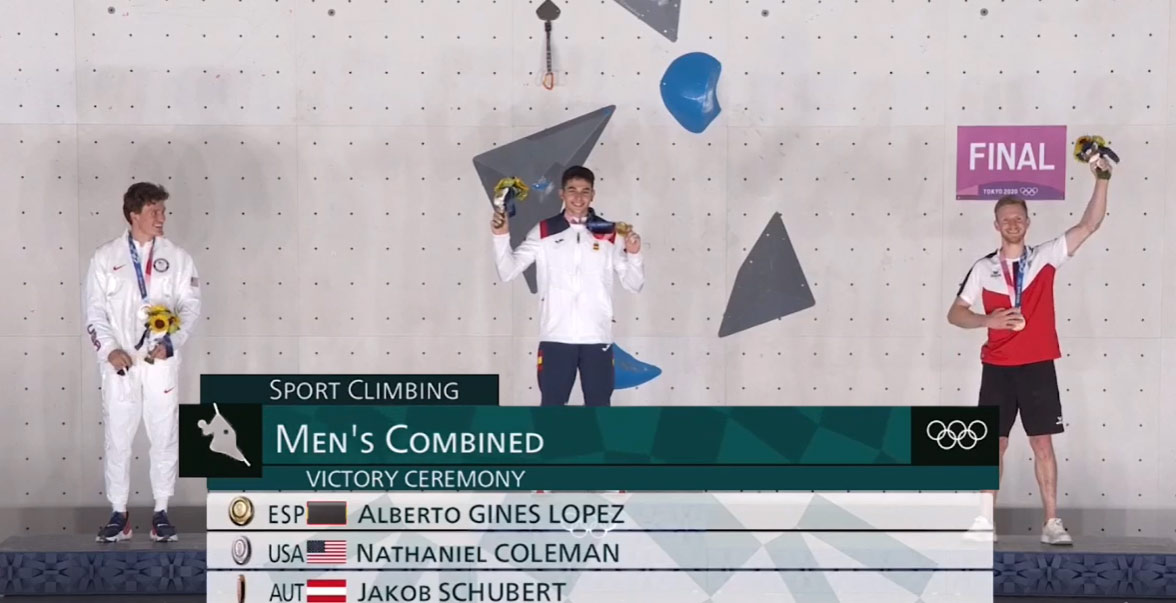 В Токио завършиха финалите при мъжете и първият олимпийски шампион по спортно катерене се казва Алберто Лопес (Alberto Lopes) от Испания! Среброто отиде при Натаниел Колеман (Nathaniel Coleman), а бронза при Якоб Шуберт (Jakob Schubert). И това се случва точно 99 години след като бяха дадени първите олимпийски медали за алпинизъм - на 5 август 1932 г. в Лос Анжелос Франц и Тони Шмид (Franz Schmid, Toni Schmid) са наградени със златни медали за първото изкачване на Северната стена на Матерхорн, както и Паул Бауер (Paul Bauer) за книгата си "За Канчендзьонга" ("Am Kangehenzonga").
