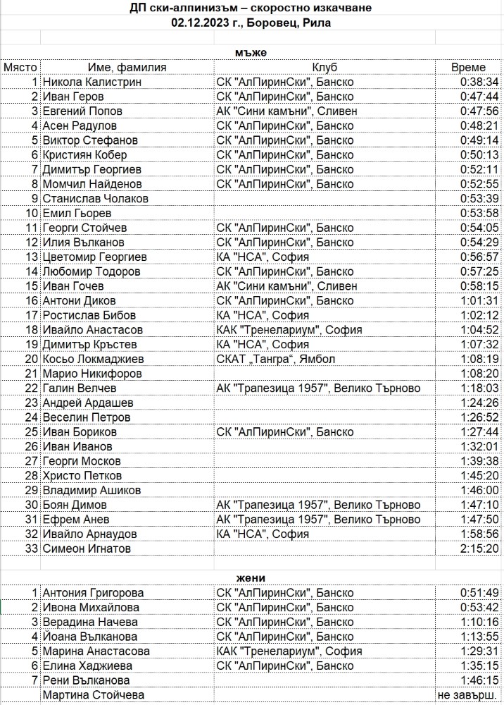 В Боровец тази неделя имаше Държавно първенство по ски-алпинизъм в дисциплината “скоростно изкачване”. Старт-финалът беше на писта “Ястребец 1”, трасето беше с дължина 3550 м и с денивелация 859 м. Антония Григорова го измина за 51:50 минути и стана първа при жените. Никола Калистрин пък постави нов рекорд по трасето - 38:34 минути, и спечели първото място.