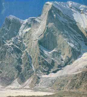 Връх Kedar Dome от югоизток. Южната стена, която е цел на българската експедиция, е тази която се вижда вляво от добре очертания ръб в средата (по него е унгарския маршрут, а вдясно от него по стената е полския маршрут).