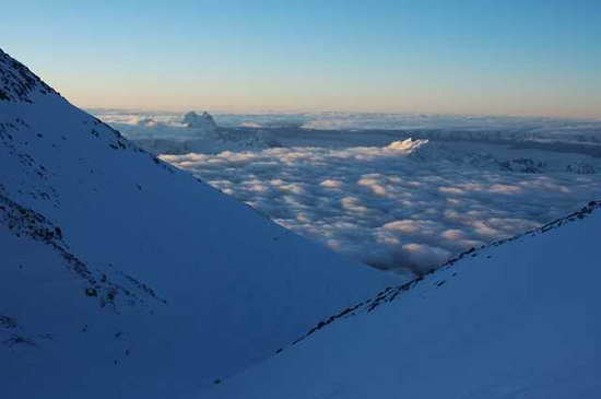 Одинадцати е в здрава мъгла. Всъщност мъгливо е до 4300, и стърчат само тук таме разни кавказки “четыретысячници” както им викат там –Донгуз Орун, Ушба, Тихтенген, Безенгийската стена и още тук таме по някой още.