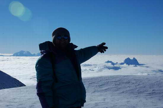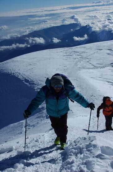 Както му казват – доста било “амбициозно”. Никой този път не си прави експерименти с одеждата, който има пухенка я е навлякъл, а другите гледат. Тъмно е като в рог, а студът - сибирски. Малко преди Полката вече не си чувствам краката, ръцете отдавна служат за нищо, и при все това продължавам нагоре глупашката. Друг един си разпрал муцуната с някакво съоръжение за чистене на скреж от очилата, вградено в ръкавицата, докато си размазвал сопола и сега хвърля пръски кръв. Картини разни. Нещастието – пълно. И от време на време се разнася прочутата Елбруска смрад. На седлото се развиделява, а аз усещам, че краката ги няма. Дават ми медикамент за тях, но действието му се забавя някъде във времето. Колоната вече качва диагоналния траверс на западния връх, а аз прогресивно изоставам. Там където слънцето огрява върха спирам и си събувам обущата.