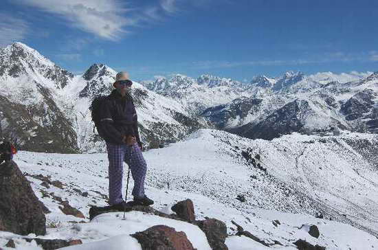 Вр. ИтколбашиКакто му казват – доста било “амбициозно”. Никой този път не си прави експерименти с одеждата, който има пухенка я е навлякъл, а другите гледат. Тъмно е като в рог, а студът - сибирски. Малко преди Полката вече не си чувствам краката, ръцете отдавна служат за нищо, и при все това продължавам нагоре глупашката. Друг един си разпрал муцуната с някакво съоръжение за чистене на скреж от очилата, вградено в ръкавицата, докато си размазвал сопола и сега хвърля пръски кръв. Картини разни. Нещастието – пълно. И от време на време се разнася прочутата Елбруска смрад. На седлото се развиделява, а аз усещам, че краката ги няма. Дават ми медикамент за тях, но действието му се забавя някъде във времето. Колоната вече качва диагоналния траверс на западния връх, а аз прогресивно изоставам. Там където слънцето огрява върха спирам и си събувам обущата.