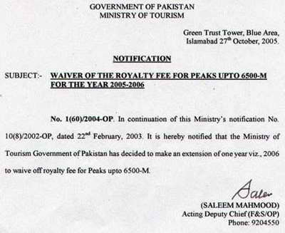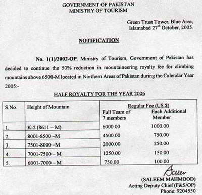 “Планинарите и алпинистите със задоволство ще научат новината, че правителството на Пакистан реши да продължи срока на намалението с 50% на таксите за върхове над 6500 м – пише в писмо до сайта вицепрезидентът на Пакистанския алпийски клуб Назир Сабир. – Освен това властите се отказват от събиране на такси за атакуване на всички върхове под 6500 м.