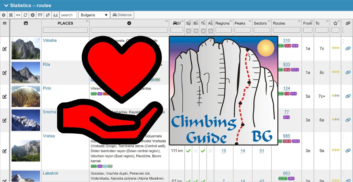 За създаването и поддържането на този сайт са изразходвани хиляди часове труд и много средства, години наред. За да продължи да съществува и да се развива, а предлаганата информация и услуги да останат безплатни, имаме нужда от вашата подкрепа. Можете да ни подпомогнете със сума, която е по вашите възможности и желание, а ние ще продължим да поддържаме и разработваме тази база данни, от която се надяваме и следващите поколения катерачи да могат да се възползват.