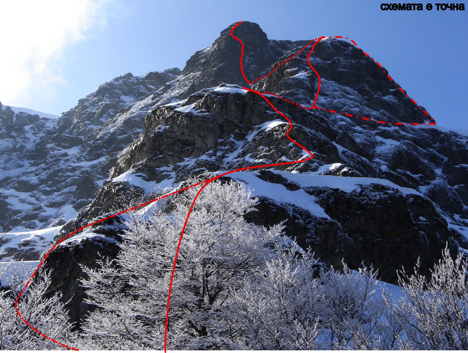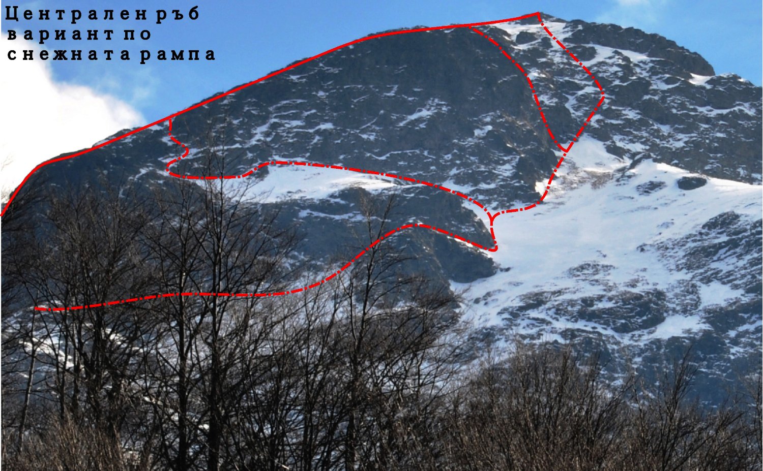 Дълъг – 15 въжета, като цяло лек маршрут, но особено опасен при лоши метереологични и климатични условия, поради това, че по маршрута почти няма клинове за осигуровки. Често маршрутът се натича с лед. Има вероятност от изгубване в горната част. Вариантът на 10 и 11 въже подсича лавиноопасен склон. Преминаване и варианти: Изкачването започва по лека плоча или отляво по голям тревист винкел с един клин. След първото стъпало следва лек склон, после отново леки скални пасажи и се достига характерно второ стъпало. Варианти: прагът може да се подсече:/А/ отдясно – около 100 метров траверс надясно над силно лавиноопасно снежно поле, непосредствено до скалите и да се излезе на реброто на тур “ПКСС”, откъдето отново наляво и се връща на реброто./Б/ централно – по средно трудни скални пасажи./В/ отляво – също лавиноопасно, прави се отново траверс под скалите наляво. След 50м се прави импровизирана осигуровка на скалите /характерно2-3 метра високо, но дълго хоризонтално прагче. То се преодолява с ляв траверс още 10-15м и от там нагоре по първоначално заледен, но иначе лавиноопасен стръмен кулоар в който има възможности да поставяне на някой друг френд. След като свърши въжето – 50м се забива скален клин за площадка. От там след около 20м се прехвърля снежното ръбче и наляво отново под скалите с леко слизане отново се забива клин за площадка. От там право нагоре по стръмен понякога заледен на едно място през лятото отвесен лавиноопасен кулоар оформен от скалните кули на второто и третото стъпало се излиза в основата на третото скално стъпало, където се съединява с ръба, където излиза и реброто на тур “ПСС”. Преминавано е и по стената отдясно на кулоара – по отвесни леки, но ронливи камини и корнизи до излизане над отвеса на второто стъпало. От там оригиналния тур върви право нагоре, но най популярен е варианта с около 100м траверс надясно, също лавиноопасен, под скалите като се достига характерна премка. От там право нагоре по около 150 метрова лавиноопасна снежна рампа, се достигат финалните участъци на тура. Възможно е и на около 30 м от началото на рампата да се траверсира отново наляво и да се достигне гребена, по който да се продължи до засичането с кулоара. Излизането от варианта става или по характерен скален кулоар леко наляво, след което пред скално стъпало и заледен винкел с един клин да се достигне ръбът от североизток или право нагоре през скално – тревни участъци с около две дължини на въжено да се излезе на тревните участъци водещи към купола на върха, което е и краят на тура. Катеренето през кулоара и последващия ръб при лошо време и силен вятър е най-опасната част от маршрута и следва да се извършва с много добра осигуровка и никакво развръзване от въжето. Препоръчително е лекото излизане на изток, наляво, за да се избегнат лавиноопасните снежни навеища непосредствено над ръба на стената.
