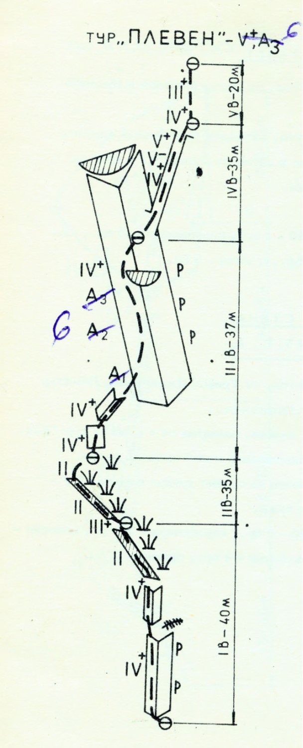 1-во въже (50+ м). Започва с късо отвесно винкелче, 5-. Катери се по лявата му обсипана с вертикални цепки стена, вижда се 1 стар клин на 4-5 метър. След това пасажи от 3-4 категория диагонално наляво водят до тревен пояс. Разпъва се цялото въже до хубава площадка с 2 клина. Площадката на тур "Стрелец" е 10-тина метра, а на "Йосемити" 5 метра по-рано (ако искаме по тях да избегнем 2-рото въже на "Плевен", което е тревисто).
