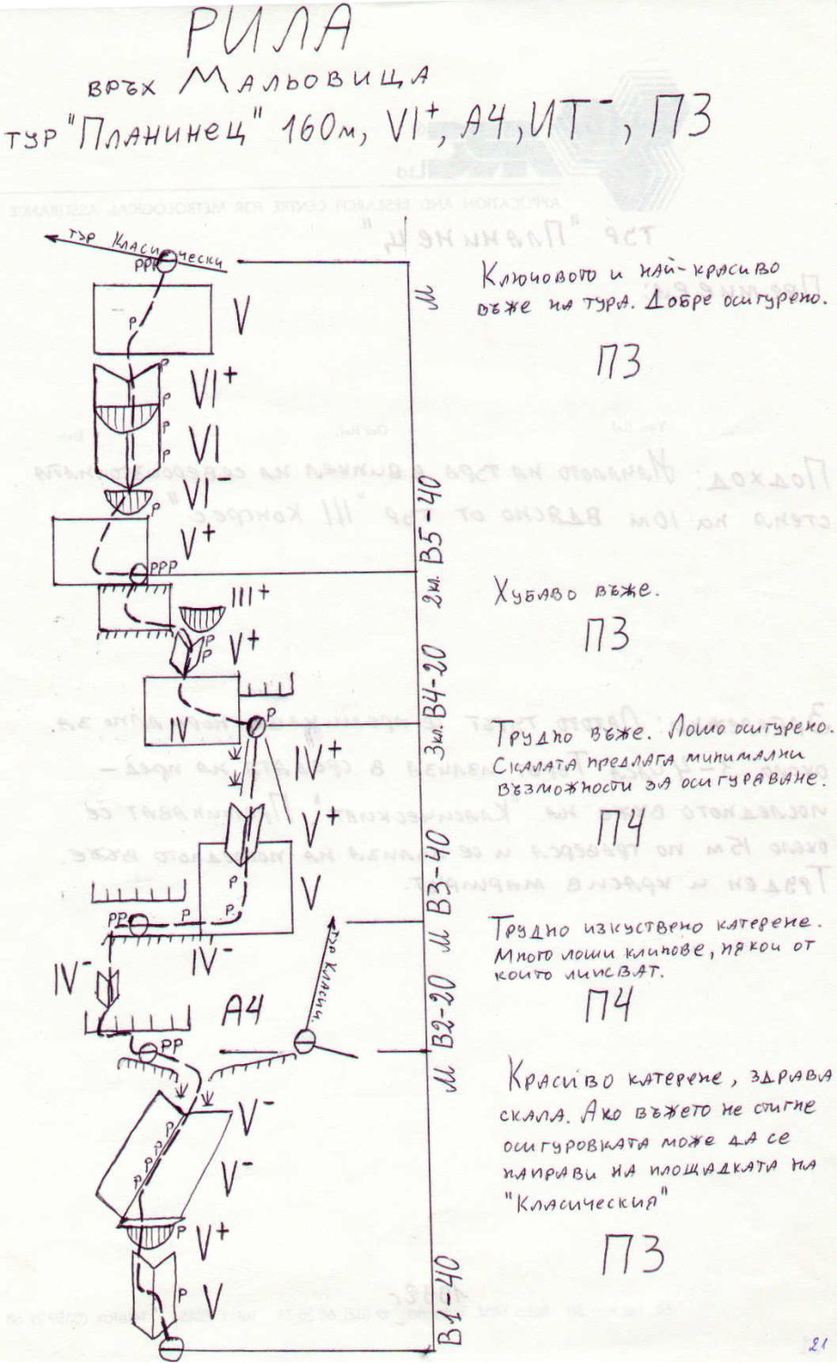 1-во въже достига по отвесен, а след това наклонен надясно винкел, 5+, до площадка, разположена на няколко метра вляво от Класическия тур, под доста голям таван.