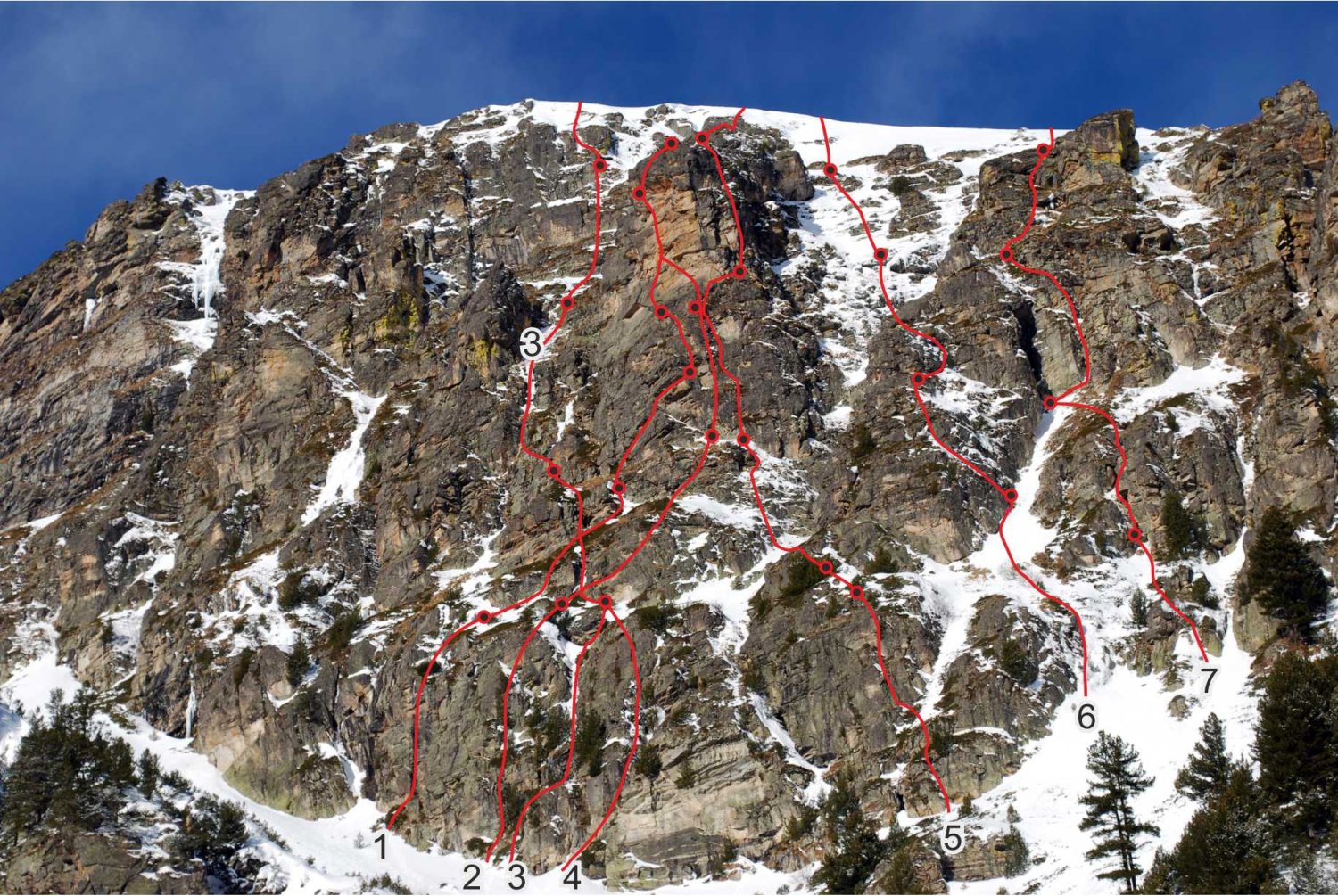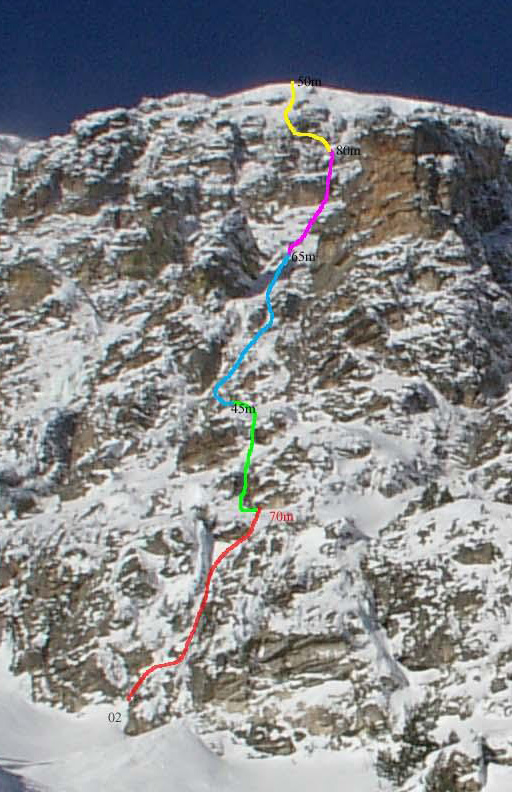 5-то въже. “Веселият Роджър”. По снежен склон се катери нагоре и леко вдясно. Достига се малък скален праг в долната част с отвесен лед – 3 метра. След него по наклонен траверс наляво се заобикаля последната скаличка и се достига билото. Последната осигуровка може да се направи на сечива на самия склон или по-нагоре на самотна скала. 50 метра.