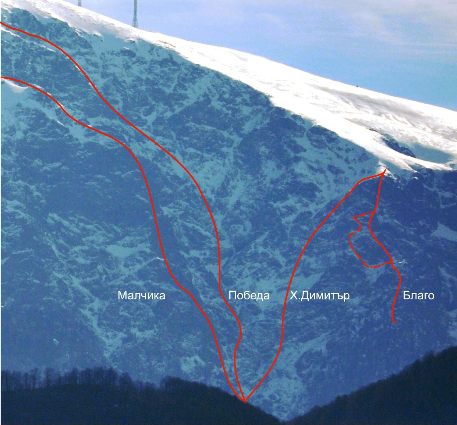 централният улей на северозападната стена заедно с турове „Малчика" и „Победа". Използват се П4 и П6.