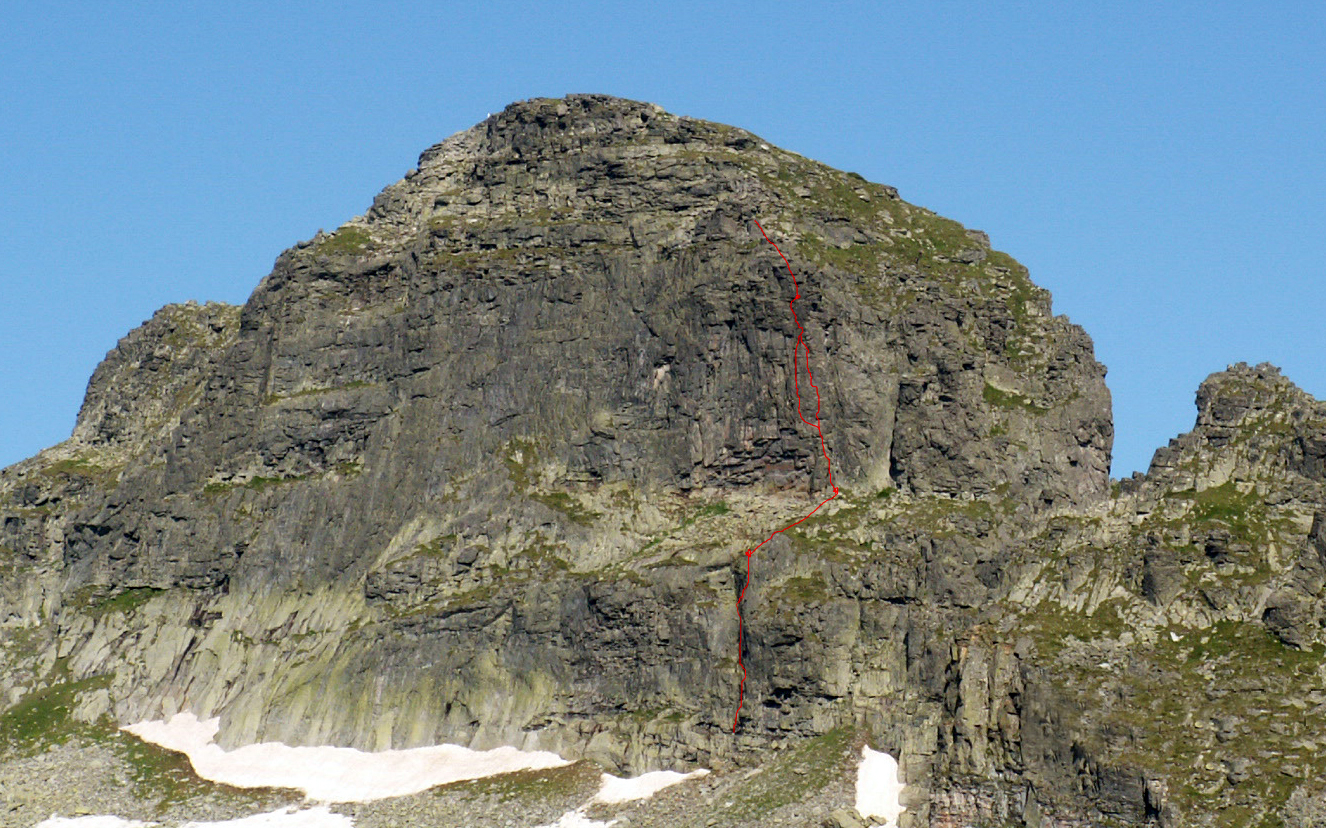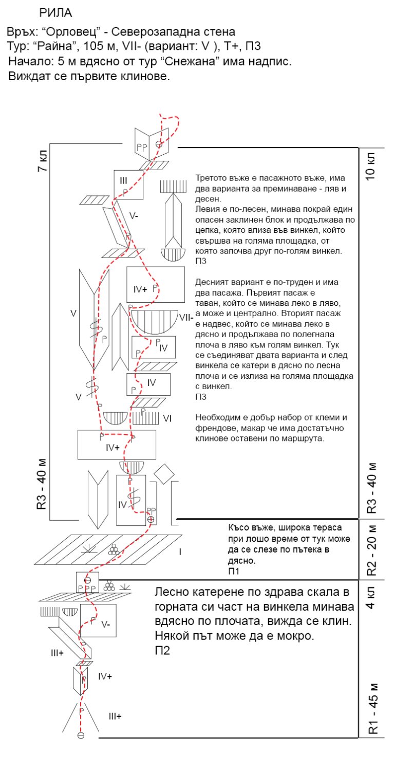 1-во въже 45 м. Лесно катерене по здрава скала. В горната част на винкела се минава вдясно по плоча, вижда се клин. Някой път може да е мокро.