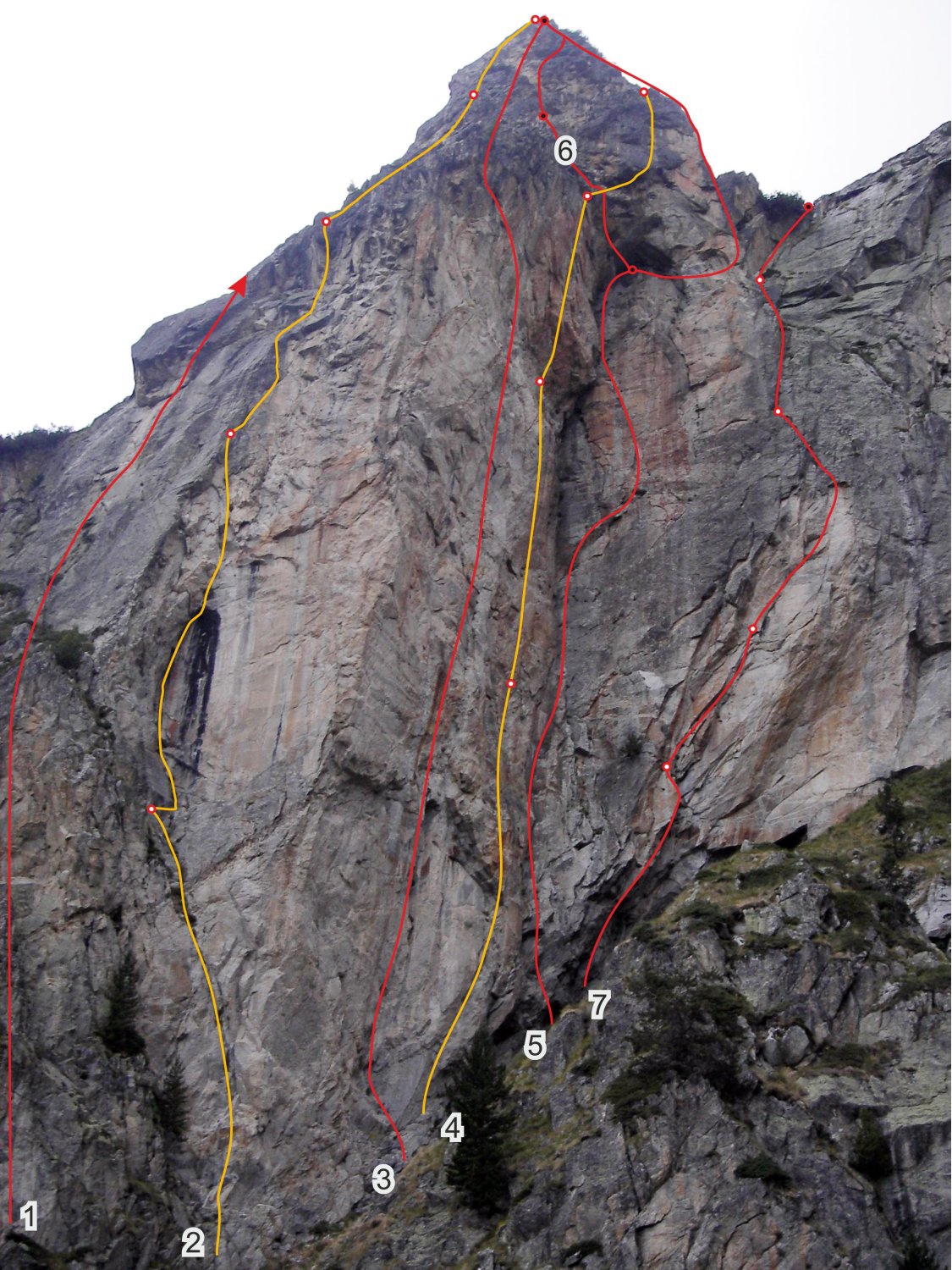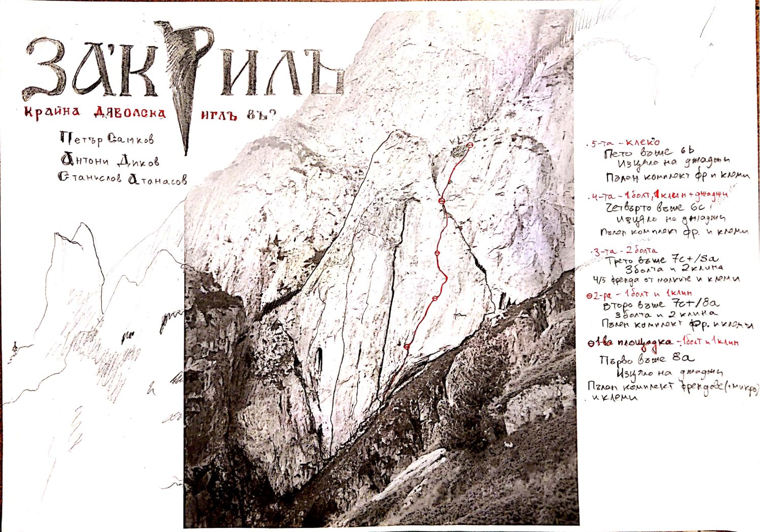 Въже 2: 7c+/8a, 3 болта и 2 клина, пълен комплект френдове и клеми. Площадка на болт и клин.