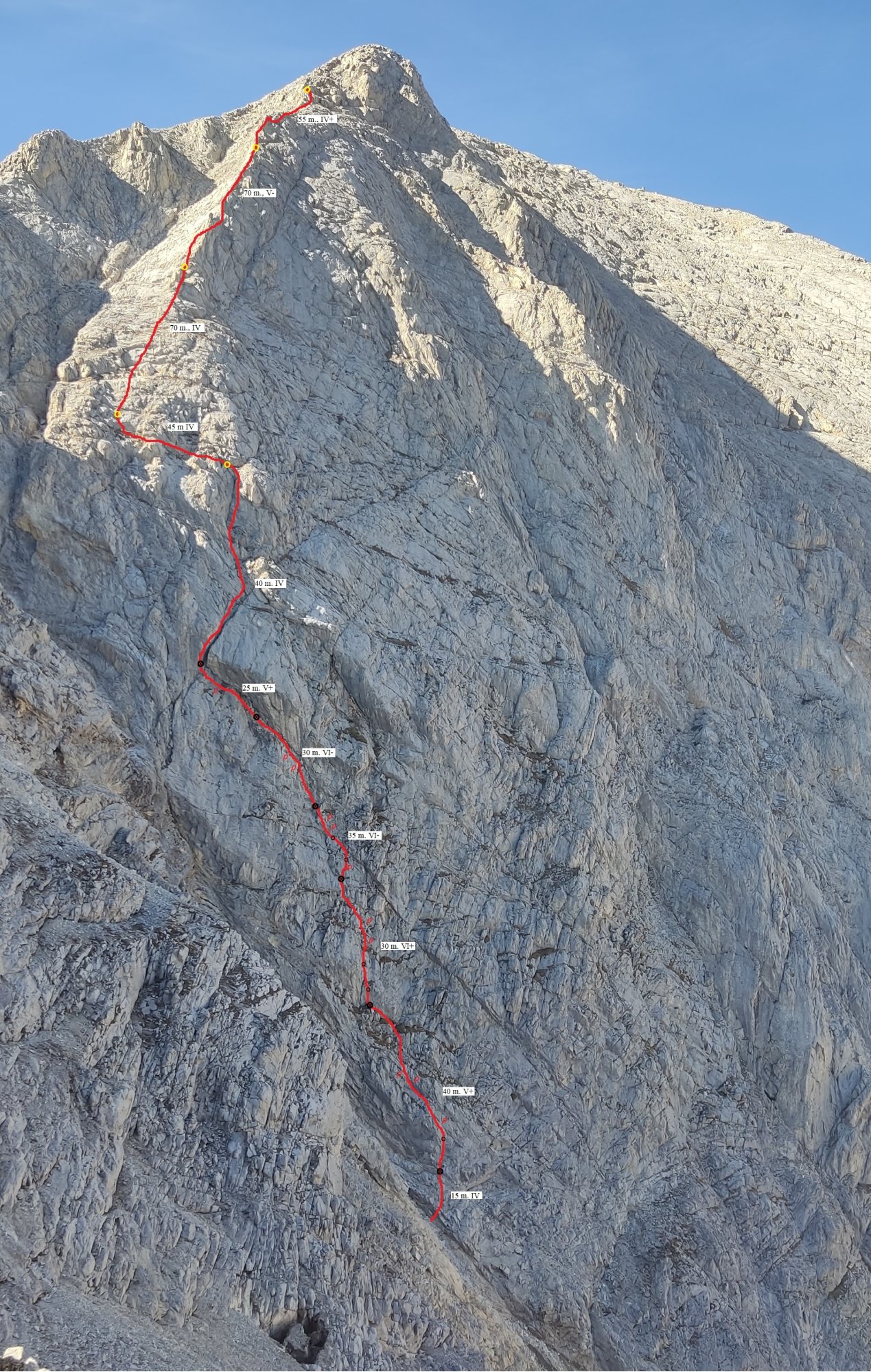 5 въже - 30 m. Труден и монолитен винкел с осигуровка рингова лента, следва деликатно излизане през разрушена скала (VI-). Осигуряване на два клина и френдове до болт на монолитна плоча с лоша и неудобна площадка.