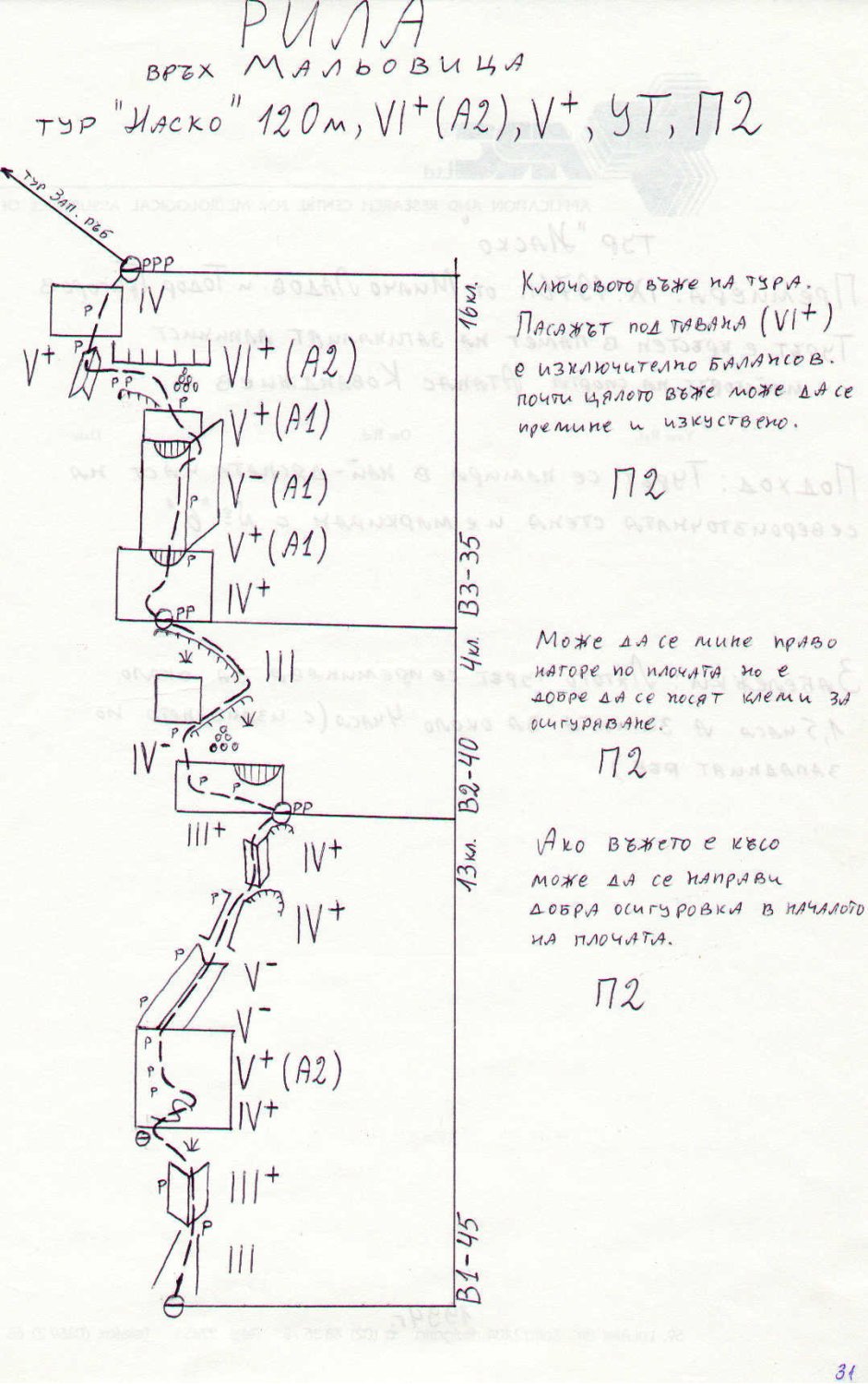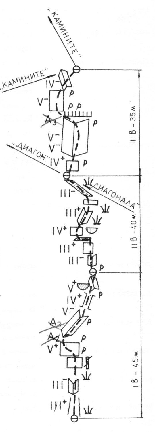 характерен каминообразен винкел, намиращ се в дясната аст на стената на 20 м. вдясно от тур Кавказ. Има стара маркировка с триъгълник и номер 6.
