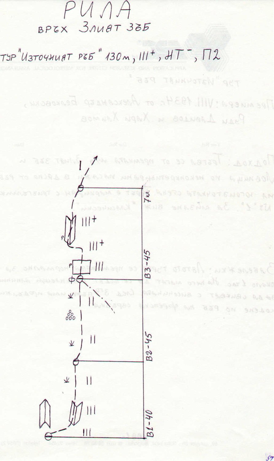 1-во въже: 40 м. 4 кат., няколко склани клина и няколко джаджи. Достига се скално-тревен пояс. Площадка се прави при скалата над него.
