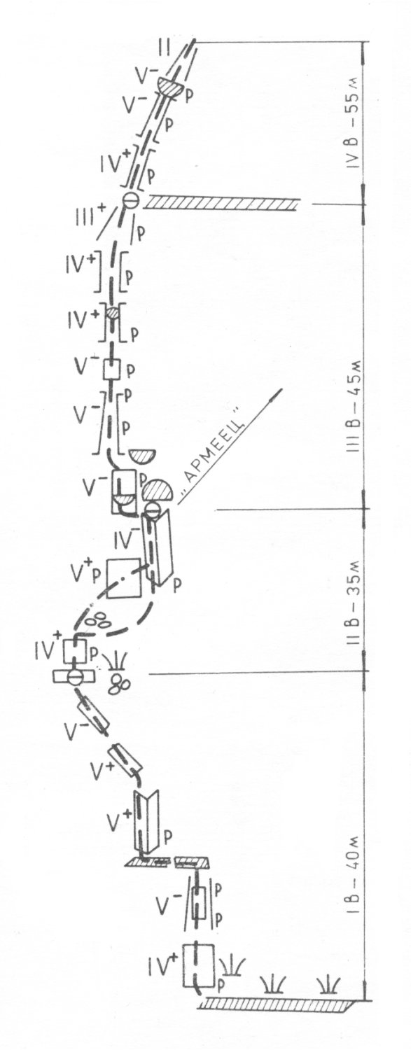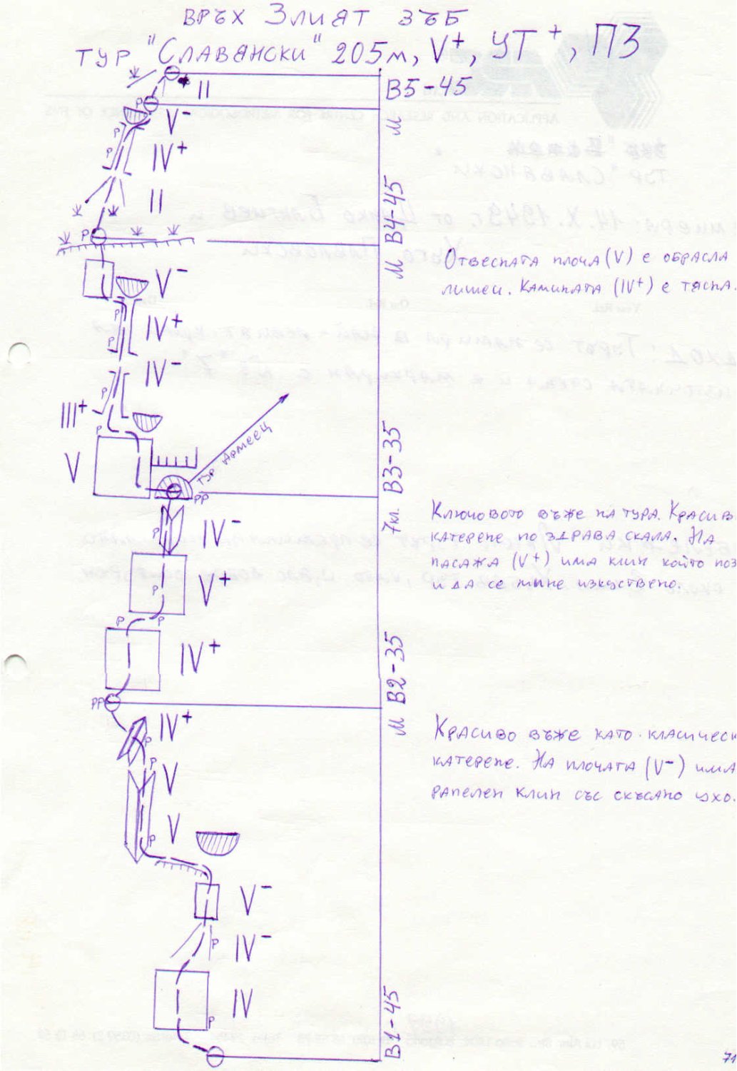 19.9.1951 г. – Енчо Петков и Христо Борисов правят вариант вляво над горния траверс на Злия зъб, показан на топото с буквата "a".