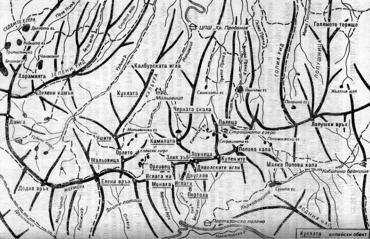 Карта с катерачните обекти в източната част на Рила (районите на хижа Мусала, хижа Заврачица, хижа Белмекен)