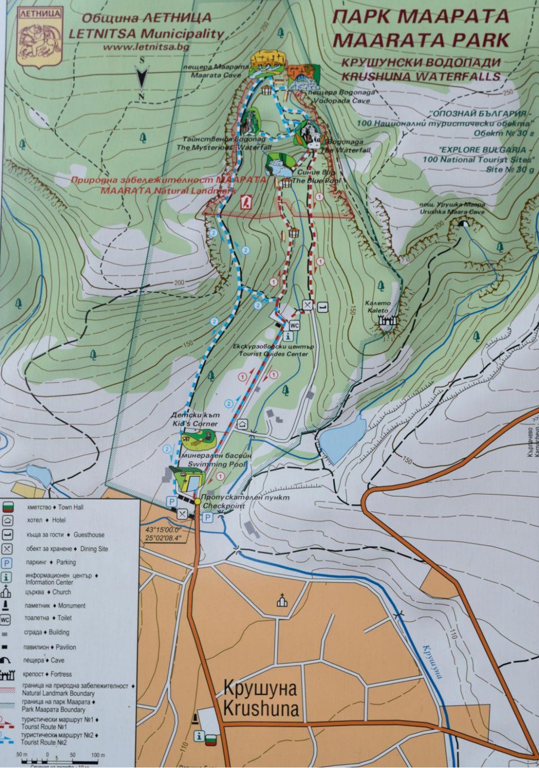 От центъра на село Крушуна се кара по главната улица на юг. След 450 м се достига до порталът за вход в лесопарка. Може да се мине и през него, но се плаща вход. Паркира се на 80 м нагоре (изток) по разширения за паркиране черен път, до точка GPS 43.249843,25.036852, 120 м.н.в. От тук през тясна обрасла в храсти пътечка право на юг се минава покрай изоставена сграда и свивайки надясно след 80 м се излиза на широк черен път. По него се върви ок. 800 м до началото на маршрутите (GPS 43.242860,25.034640) и след още 50 м до огромната ниша – пещерата Маарата, от която извира поточе. Общо 15 мин от паркинга.