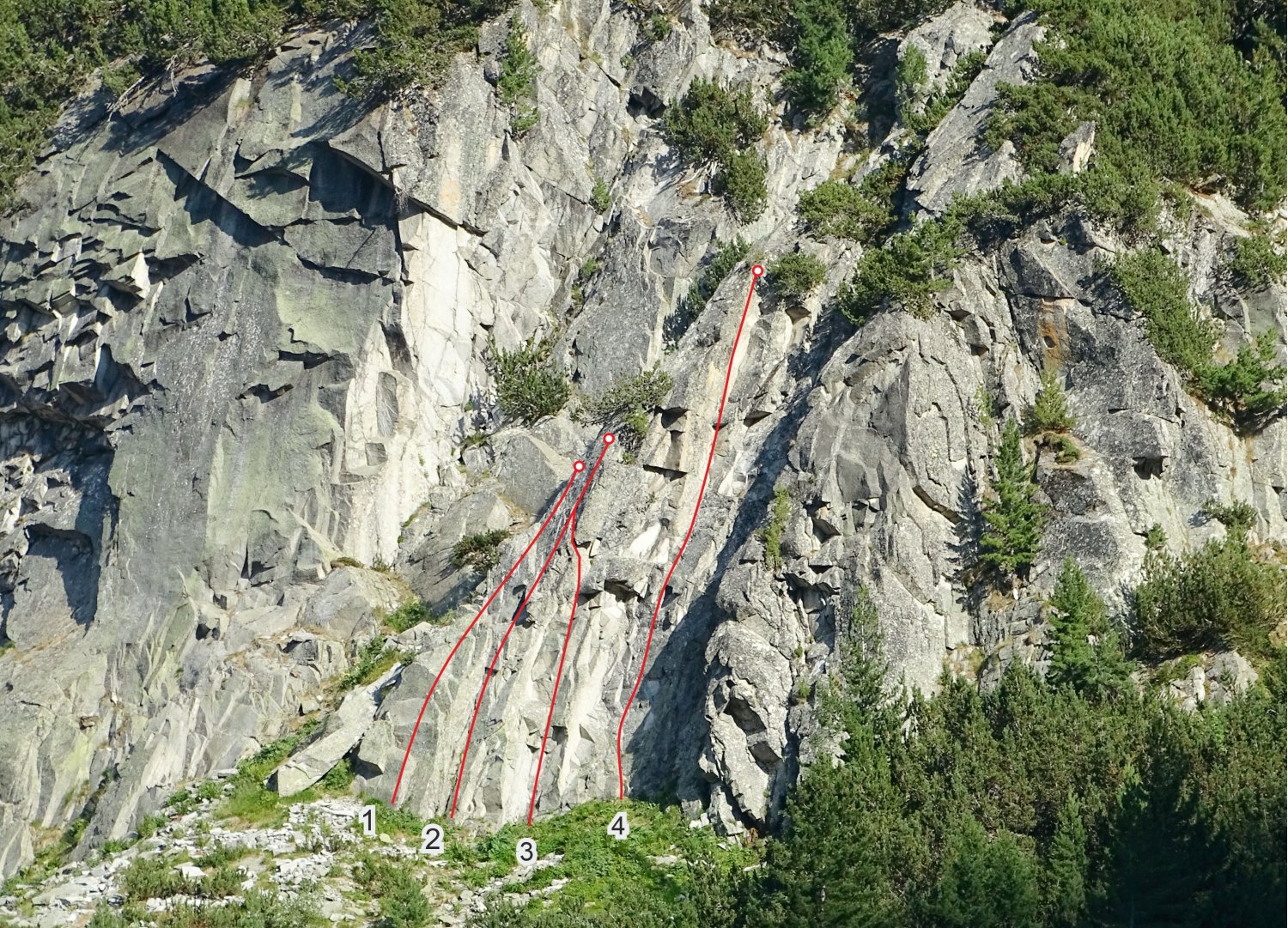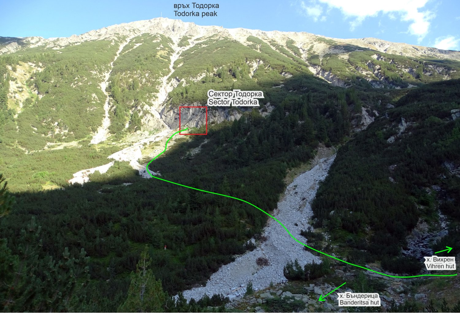 каменист лавинен улей до отсрещтната му страна, обрасла с клекове. Търси се началото на пътечка в тясна просека между клековете. Следва се пътечката между клековете, маркирана с пирамидки. След ок. 200 м тя извежда до основния каменист улей, спускащ се от връх Тодорка. Изкачването е стръмно по него, маркирано с пирамидки в десния край. Скалите се виждат горе вдясно. Подход 30 мин от хижата, 150 м денивелация.