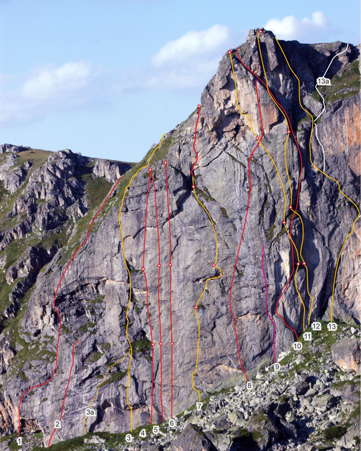 Първо, второ и трето въже са екипирани с анкерни болтове и планки (може да се слезе на рапели). Четвърто въже е на скални клинове и джаджи.
