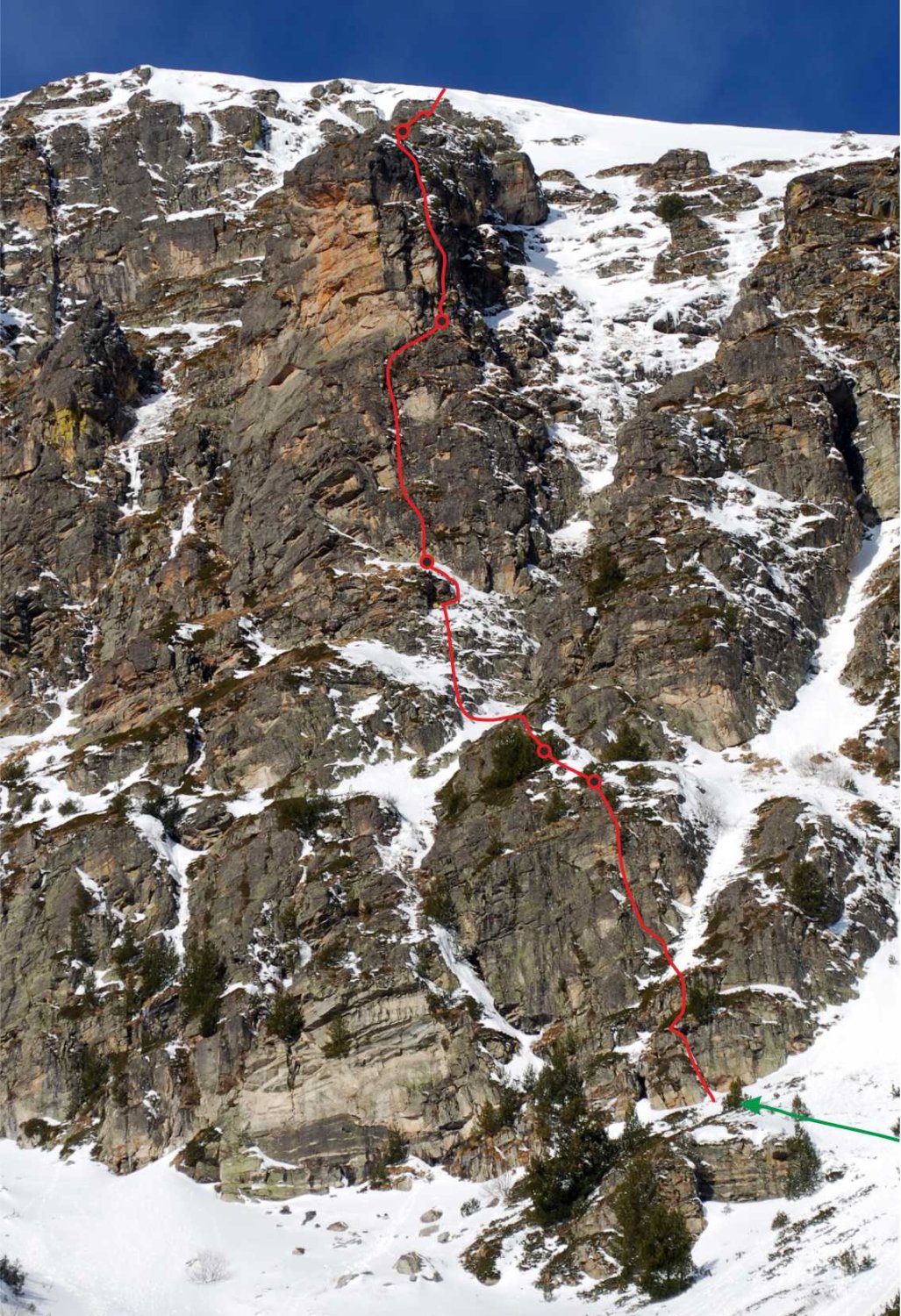 1-во въже – 60 м + 10 м по равно. Катери се по челната стена на игла, която е сателит на бастиона. Началото е по лявата страна на 10-метров винкел до надвесче. Следват туфи надясно и 8 м отвесна стена, която се преодолява фронтално. Къс снежен кулоар води до почти отвесна скална стена, по която на ръбчета се катери нагоре и наляво. Осигурява се на малки, но здрави дървета. След събиране на свръзката осигуровката се мести 10-12 м по равното в дъното на терасата.