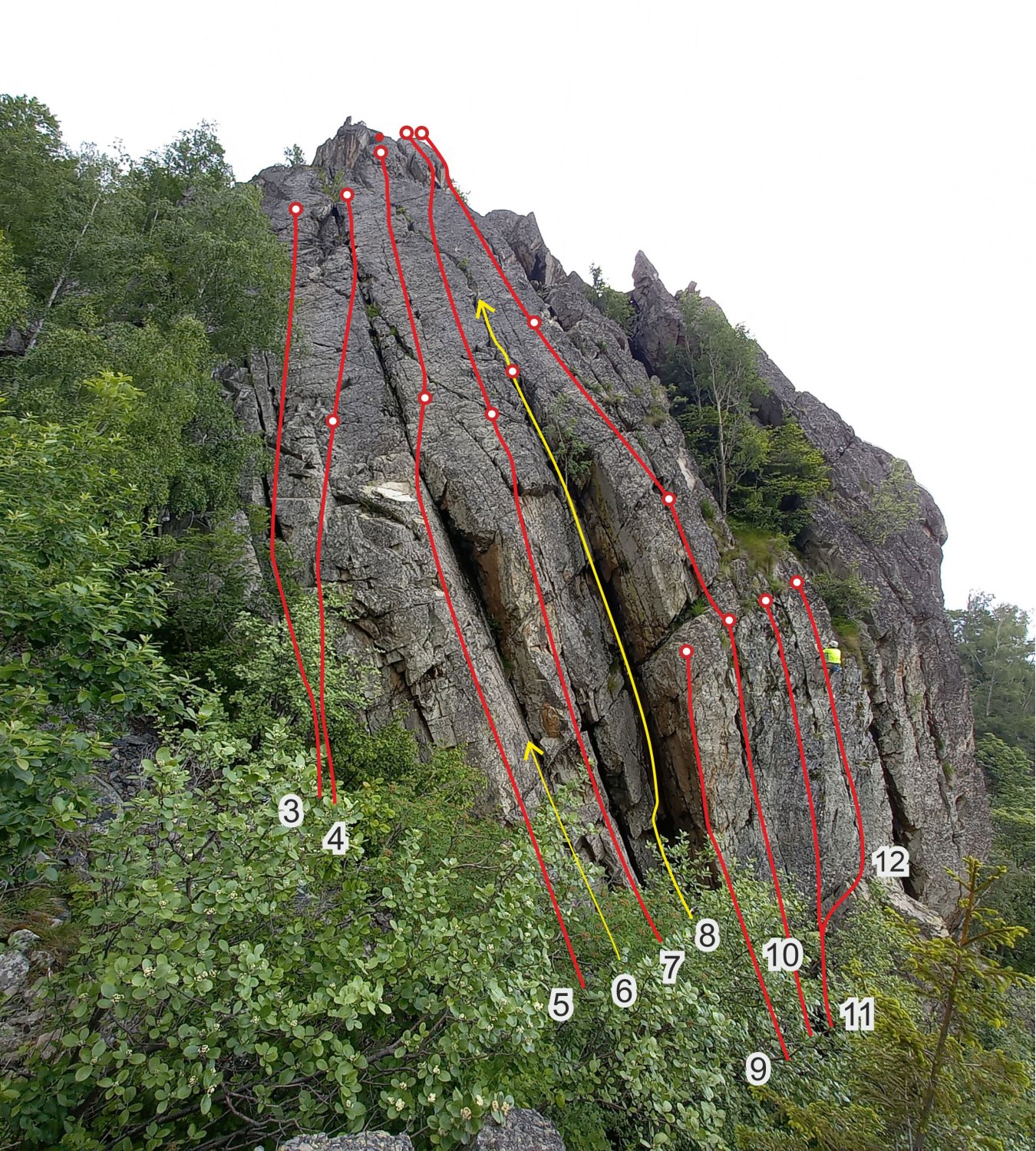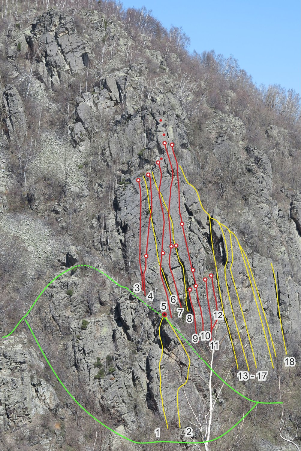Спортните маршрути са очертани с червени линии, а традиционните с жълти линии. Спортните са екипирани с лепени клинове, и от всички може да се слезе на рапел (1 или 2) с въже 60 метра, но препоръчително е 70 м и повече.