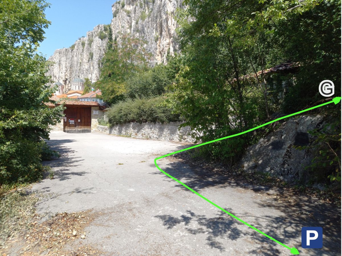От паркинга се тръгва към портите на манастира покрай бариерата по асфалтовия път. След 230 м, 10 м преди самите порти, отдясно започва хубава маркирана пътека , има стрелка(GPS 43.122680,25.622040). Върви се по нея с плавно набиране на височина, диагонално под скалите. Още в началото на 50 м има разклонение, хваща се лявото. Секторът се познава по маршрутите с лепени клинове, които се виждат от земята. Общо 15 мин от паркинга.