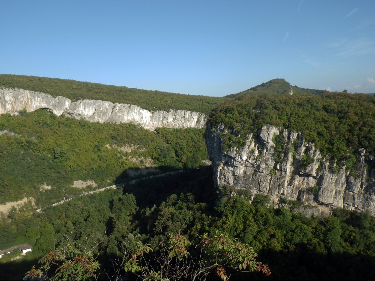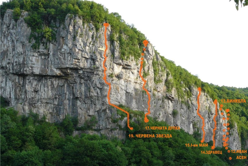 Скалният венец се извива дъгообразно и отляво надясно има последователно източно, северно и западно изложение. Продължението му наляво достига до сектора до реката и металната стълба. В десния край се намира благоустроената пещера Бачо Киро.